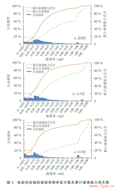 經(jīng)驗統(tǒng)計法是以巖心分析孔隙度、滲透率資料為基礎(chǔ),以低孔滲段累計儲滲能力丟失占總累計的5%左右為界限的一種累計頻率統(tǒng)計法,現(xiàn)已被國內(nèi)各大油田所采用[1-6]。利用蘇東地區(qū)盒8段、山1段、山2段儲層常規(guī)物性分析資料,編制的孔隙度、滲透率頻率分布、累計頻率及累計能力丟失曲線見圖l、2??紫抖葍饽芰ΑB透率產(chǎn)氣能力的計算公式為: