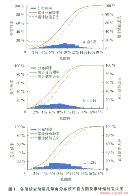 經(jīng)對蘇東地區(qū)盒8段、山1段、山2段的物性特征、巖性特征和孔隙結(jié)構(gòu)特征分析,認(rèn)為該區(qū)儲層為典型的中低孔-低孔、低滲-特低滲儲層。孔隙度為5%~l5%,滲透率為0.1~1.0 mD,滲透率能力較差。按照經(jīng)驗統(tǒng)計法(圖1、2),考慮到長慶油田低孔、低滲的儲層特點(diǎn),按照累計頻率丟失不超過總累計的20%,累計儲能、產(chǎn)能丟失不超過總累計的l0%。當(dāng)