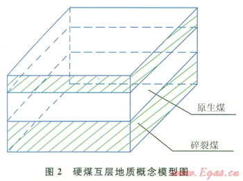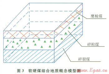 當(dāng)煤層段形成過(guò)程、形成后遭受的構(gòu)造運(yùn)動(dòng)強(qiáng)烈程度不同時(shí),導(dǎo)致煤層段巖石力學(xué)性質(zhì)差異性較大時(shí),即軟煤(碎粒煤和糜棱煤)和硬煤共存,第一次壓裂時(shí),大部分壓裂液進(jìn)入軟煤,壓裂效果不甚理想,為了在硬煤中進(jìn)行壓裂,則需要使用投球技術(shù),此類(lèi)情況的地質(zhì)概念模型如圖3所示。