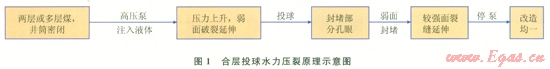 合層投球水力壓裂是基于間距較小、非均質(zhì)性差異相對(duì)比較大的兩層或多層煤為前提,把井筒作為一個(gè)密閉系統(tǒng),通過(guò)地面高壓泵把液體注入井筒,當(dāng)達(dá)到煤層某些地方的破裂壓力時(shí),首先破裂進(jìn)行延伸,為防止裂隙閉合,并進(jìn)行加支撐劑操作來(lái)支撐裂縫。因煤儲(chǔ)層非均質(zhì)性強(qiáng),巖石力學(xué)性質(zhì)差異性大,勢(shì)必造成在煤層某些段裂縫延伸較遠(yuǎn),某些煤層段裂縫延伸較近,為了限制這些裂縫延伸遠(yuǎn)的繼續(xù)延伸,同時(shí)使裂縫延伸近的能夠進(jìn)一步延伸擴(kuò)展,此時(shí)投入一定數(shù)量的尼龍球(也可以是其他材料制作的球),把裂縫容易延伸的那部分孔眼堵塞,迫使施工壓力和有效排量發(fā)生改變,達(dá)到改造初始裂縫延伸距離近的那部分層段的目的。因此,能否使初始裂縫延伸近的層段進(jìn)一步得到改造,合理的投球數(shù)是決定因素。其壓裂原理如圖1所示。