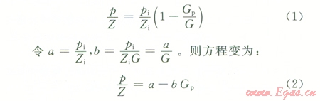 由式(2)可知,對(duì)于定容封閉氣藏,視地層壓力(p/Z)與累計(jì)采氣量(Gp)為直線關(guān)系。根據(jù)不同階段視地層壓力與相應(yīng)累計(jì)采氣量的回歸直線可求得氣井動(dòng)儲(chǔ)量。壓降法適合采出程度大于10%,且至少具有兩個(gè)關(guān)井壓力恢復(fù)數(shù)據(jù)點(diǎn)的井。采出程度過(guò)低,壓力、產(chǎn)量誤差對(duì)計(jì)算結(jié)果影響較大。