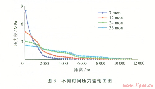 根據(jù)數(shù)值模擬軟件運(yùn)算結(jié)果,繪制典型剖面壓力分布圖,當(dāng)注入7個(gè)月后井底壓力達(dá)到28 MPa,壓力逐漸向外為擴(kuò)散,若假設(shè)不注條件下,由于南區(qū)和長(zhǎng)北合作區(qū)壓力差的存在,壓力波也會(huì)隨時(shí)間的延長(zhǎng)向外擴(kuò)散。用以上兩個(gè)壓力剖面相減,即可得到壓力剖面上注采過(guò)程中不同距離與壓力差之間的關(guān)系(圖3)。設(shè)置可以觀察的基準(zhǔn)壓力值,即可得到不同注采周期下,壓力波的傳播距離在1、2、3年的注氣周期下壓力波傳播距離分別為4. km、6.1 km和7.6 km。
