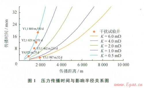 根據(jù)影響半徑計(jì)算公式,取榆林南儲(chǔ)氣庫(kù)建設(shè)區(qū)儲(chǔ)層孔隙度為0.06,天然氣黏度為0.02 mPa·s,綜合壓縮系數(shù)為0.02 MPa-1,分別對(duì)滲透率為0.5~6.0mD等不同條件下傳播時(shí)問(wèn)與壓力影響半徑進(jìn)行計(jì)算,繪制壓力傳播時(shí)間與距離關(guān)系圖版(圖1)。
