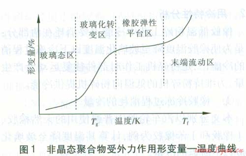通常所說的橡膠是指玻璃化溫度(Tg)低于室溫的非晶態(tài)聚合物。橡膠和塑料就是按照玻璃化溫度是在室溫以上還是在室溫以下進(jìn)行區(qū)分的。玻璃化溫度在室溫以下的聚合物稱為橡膠,玻璃化溫度在室溫以上的聚合物稱為塑料。玻璃化溫度是聚合物的特征溫度之一,非晶態(tài)聚合物在玻璃化溫度附近發(fā)生玻璃態(tài)一橡膠態(tài)轉(zhuǎn)變。圖l為非晶態(tài)聚合物受外力作用產(chǎn)生的形變量一溫度變化曲線。對于同一種聚合物,當(dāng)其溫度大于Tg時,聚合物處于橡膠態(tài);當(dāng)溫度小于Tg時,聚合物處于玻璃態(tài)。處于橡膠態(tài)的聚合物當(dāng)有外力作用時發(fā)生大的形變,外力撤去后形變可以恢復(fù),也就是我們通常所說的橡膠彈性。在一定溫度范圍內(nèi)(橡膠彈性平臺區(qū)),當(dāng)溫度降低時,處于橡膠態(tài)的聚合物在外力作用下的形變量隨溫度變化很小。隨著溫度的下降,在玻璃化溫度附近,當(dāng)溫度發(fā)生很小變化時,聚合物受外力產(chǎn)生的形變量隨溫度變化出現(xiàn)明顯變化,表現(xiàn)為隨溫度的降低形變量顯著減小。當(dāng)溫度繼續(xù)降低,聚合物進(jìn)入玻璃態(tài),此時聚合物已完成了橡膠態(tài)一玻璃態(tài)之間的轉(zhuǎn)變,在外力作用下聚合物的形變量受溫度變化影響很小,形變量也很小。廢舊橡膠低溫粉碎就是通過冷凍使橡膠溫度降至玻璃化溫度以下,使其進(jìn)入玻璃態(tài),低溫下橡膠分子鏈段不能運動,表現(xiàn)出膪|生,從而易于粉碎。