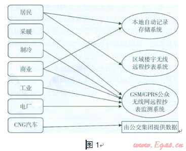 2004年初,結(jié)合“城市燃?xì)夤?yīng)規(guī)劃指標(biāo)、用氣規(guī)律及其用氣量預(yù)測(cè)的研究”項(xiàng)目的開展,北京市燃?xì)饧瘓F(tuán)通過3種方法在用戶數(shù)據(jù)采集傳輸方面做出了初步的探討與嘗試。該項(xiàng)目將北京市的現(xiàn)有燃?xì)庥脩舴譃榫用?、采暖、制冷、商業(yè)、工業(yè)、電廠、CNG汽車7類,需要采集各類用戶的小時(shí)用氣數(shù)據(jù),根據(jù)用戶性質(zhì)的不同及所用計(jì)量?jī)x表的特點(diǎn)我們分別采取以下3種方法進(jìn)行了燃?xì)庥脩舻臄?shù)據(jù)記錄、存儲(chǔ)、采集與傳輸(見圖l)。