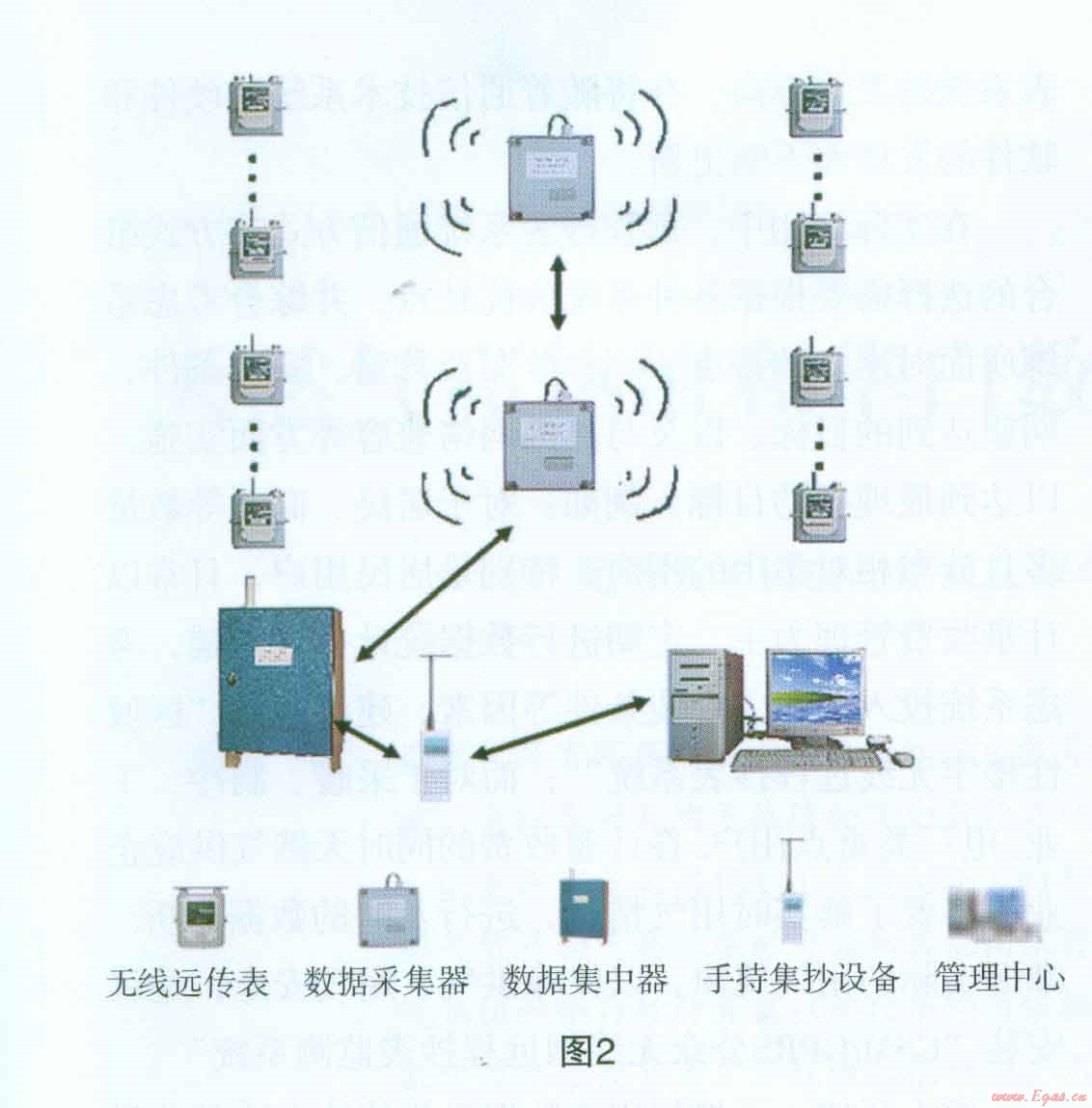 該系統(tǒng)由無線遠(yuǎn)傳表、數(shù)據(jù)采集器、數(shù)據(jù)集中器、手持集抄設(shè)備、管理巾心組成。無線遠(yuǎn)傳表、采集器、集中器之問以短距微功率無線方式傳遞數(shù)據(jù)。無線遠(yuǎn)傳表將計(jì)量的數(shù)據(jù)送至采集器;采集器收集一組無線遠(yuǎn)傳表的數(shù)據(jù)后送至集中器;工作人員定期持手持抄表設(shè)備在集中器安置現(xiàn)場(chǎng)收集無線遠(yuǎn)傳表計(jì)量數(shù)據(jù),然后帶回管理中心對(duì)數(shù)據(jù)進(jìn)行統(tǒng)計(jì)分析(見圖2)。
