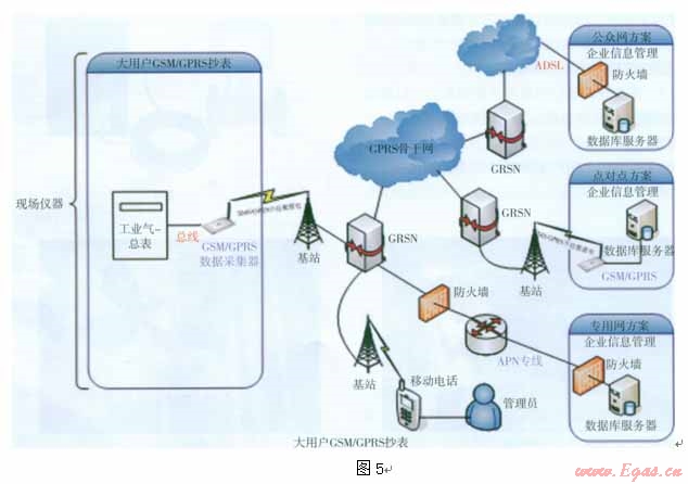及上位機(jī)數(shù)據(jù)庫管理軟件系統(tǒng)組成。主要安裝在采暖、制冷樣本用戶及部分商業(yè)、工業(yè)樣本用戶,其利用GSM無線公網(wǎng)中的數(shù)據(jù)傳輸功能(短消息方式和GPRS無線網(wǎng)絡(luò)方式)來實(shí)現(xiàn)對(duì)用戶現(xiàn)場(chǎng)燃?xì)饬髁俊毫Φ葦?shù)據(jù)的遠(yuǎn)距離無線傳輸(見圖5)。管理人員通過計(jì)算機(jī)數(shù)據(jù)庫管理系統(tǒng)采取實(shí)時(shí)讀取存儲(chǔ)數(shù)據(jù),定時(shí)發(fā)送的方式遙控用戶帶有GSM/GPRS燃?xì)獗頂?shù)據(jù)采集傳輸器的現(xiàn)場(chǎng)計(jì)量?jī)x表來實(shí)現(xiàn)信息采集與傳輸。通過幾年的使用,該系統(tǒng)運(yùn)行穩(wěn)定,抄表率較