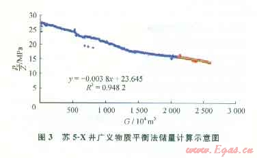 圖3為蘇5-X氣井采用廣義物質(zhì)平衡法儲(chǔ)量計(jì)算示意圖。該井于2007年10月13號(hào)投產(chǎn),截至2010年底累計(jì)采氣量達(dá)到了2574.21×104m3,2009年12月氣體流動(dòng)達(dá)到擬穩(wěn)定狀態(tài),通過線性直線關(guān)系得到:G=14286.36×104m3。