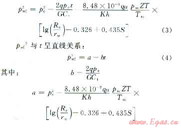 根據(jù)滲流機(jī)理,對(duì)于有界封閉低滲致密砂巖氣藏,氣井開井后可分為3個(gè)流動(dòng)階段:①地層線性流階段(無限導(dǎo)流垂直裂縫,Pwf2-t1/2呈直線關(guān)系)或裂縫地層雙線性流(有限導(dǎo)流垂直裂縫(Pwf2-t1/4呈直線關(guān)系);②平面徑向流動(dòng)階段(Pwf2-lgt呈直線關(guān)系);③穩(wěn)定流動(dòng)或邊界反映階段(Pwf2-t呈直線關(guān)系),該階段又稱為彈性二相段。井底壓力和時(shí)間滿足如下關(guān)系: