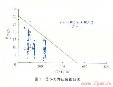 圖1為蘇5-X氣井的壓降儲(chǔ)量計(jì)算示意圖。該井于2006年10月12號(hào)投產(chǎn),截至2010年底已累計(jì)采出天然氣243.12×104m3,根據(jù)曲線可計(jì)算得到:G=530.26×104m3