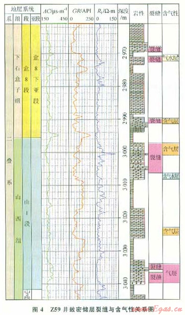 低滲透砂巖油氣藏滲流起主導(dǎo)作用的為宏觀裂縫系統(tǒng),而微觀裂縫主要是改善儲(chǔ)層的滲透性能。裂縫是低滲透砂巖儲(chǔ)層的主要滲流通道,控制了油氣藏的滲流系統(tǒng)[6]。研究區(qū)占主導(dǎo)地位的是構(gòu)造裂縫,裂縫是極好的運(yùn)移通道,是溝通孔洞、形成優(yōu)質(zhì)儲(chǔ)層的重要因素,對天然氣聚集成藏的重要影響。在裂縫較為發(fā)育的地區(qū)或?qū)佣?,尤其是對低孔、低滲的砂巖儲(chǔ)層而言,裂縫發(fā)育的層段,砂巖含氣性明顯好于一般的砂巖儲(chǔ)層,氣層、含氣層基本對應(yīng)于裂縫發(fā)育井段(圖4)。表明裂縫對儲(chǔ)層物性具有明顯的改善作用,是形成高產(chǎn)氣藏的重要條件。