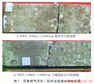 根據(jù)巖心觀察、鑄體薄片、掃描電鏡等觀察分析,發(fā)現(xiàn)研究區(qū)發(fā)育高角度構(gòu)造裂縫以及水平層理縫、粒內(nèi)縫和粒緣縫等成巖裂縫。裂縫的發(fā)育在研究區(qū)北部較普遍,鉆井巖心中宏觀構(gòu)造縫較常見,多為高角度裂縫(圖1),巖心中裂縫長度一般0.5~2m,最長可達(dá)8m,裂縫寬度2~3mm。巖心觀察表明構(gòu)造裂縫特征明顯,易于與人工破裂面進(jìn)行區(qū)別。即:構(gòu)造裂縫的破裂面平整,致密砂巖中的構(gòu)造裂縫較光滑,人工破裂面均呈參差狀,巖心表面常殘留有受力破碎而成的白色粉末痕跡;天然的構(gòu)造裂縫平面顏色黯淡,常有礦物膠結(jié)或充填,而人工破裂面新鮮干凈;天然構(gòu)造裂縫常常平行密集分布,從而將巖心切割為薄板狀。研究區(qū)構(gòu)造裂縫多為開啟性裂縫,少數(shù)見方解石半充填。