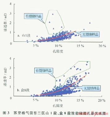 裂縫所形成的孔隙度占巖石體積的1%~2%,雖然構(gòu)成的儲(chǔ)集空間很小,對孔隙度的影響不大,但由于裂縫的存在,連通了孤立狀存在的孔隙,形成了砂巖的滲濾通道,提高了巖石的滲透率,對儲(chǔ)層的物性有明顯的改善作用。一般無裂縫發(fā)育的樣品,其孔隙度與滲透率呈現(xiàn)較好的線性正相關(guān)關(guān)系;而裂縫發(fā)育的樣品,其孔隙度并不一定很高,但滲透率明顯高于無裂縫樣品,滲透率值的分布脫離正常孔滲線性關(guān)系(圖3)。裂縫的規(guī)模越大,其滲透率增加的幅度越大。在低滲透儲(chǔ)層中,裂縫是油氣運(yùn)移和流體滲流的主要通道,可以提高儲(chǔ)層的滲透性,裂縫的存在可使儲(chǔ)層滲透率比基質(zhì)滲透率增高1~2個(gè)數(shù)量級,并使其水平滲透率各向異性在50∶1以上[5]。
