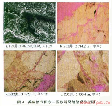 鑄體薄片、掃描電鏡中常見成巖裂縫,以溶蝕縫最常見(圖2),收縮縫和貼粒縫最少。研究區(qū)約30%的砂巖粒間孔具有溶蝕現(xiàn)象,在鏡下所見微孔隙直徑主要范圍在介于5~50μm,延伸范圍常超出視域,溶蝕裂縫形態(tài)多呈不規(guī)則彎曲狀,微裂縫可見分岔,溶蝕裂縫常溝通孔隙,改善儲(chǔ)層孔隙結(jié)構(gòu)。