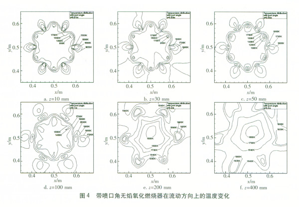 圖4給出了帶噴口角無(wú)焰氧化燃燒器溫度沿燃燒器軸線方向的變化情況。從圖4a可看出,燃燒器區(qū)域的最高溫度1 700 K位于空氣射流的某個(gè)半徑處,這表示空氣射流卷吸其附近的天然氣和燃燒產(chǎn)物使氧化劑、燃料和產(chǎn)物的比例在該空氣射流半徑處達(dá)到最佳的狀態(tài)。燃燒首先在那里發(fā)生,朝空氣射流中心的周圍擴(kuò)散。當(dāng)流動(dòng)進(jìn)一步向下游推進(jìn)時(shí),燃燒強(qiáng)度進(jìn)一步增加,溫度逐漸上升,最高溫度大約出現(xiàn)在z=100 mm處。在z=100mm之后,由于燃料大部分被燃燒,溫度又開(kāi)始逐漸降低,并且由于混合更充分,溫度也變得更均勻。另外,由于噴嘴沿軸心具有向外的傾角,沿著軸線方向射流問(wèn)的間隔也變得越大(即從射流整體運(yùn)動(dòng)來(lái)看,它像一個(gè)圓錐擴(kuò)展運(yùn)動(dòng),因此沿著石方向,即圓錐軸線方向,在圓錐橫截面上的各分射流間隔越來(lái)越大),在空氣射流和燃料射流混合之前,它們更充分地被燃燒產(chǎn)物所稀釋,燃燒區(qū)域更大,因此最高溫度也較低。