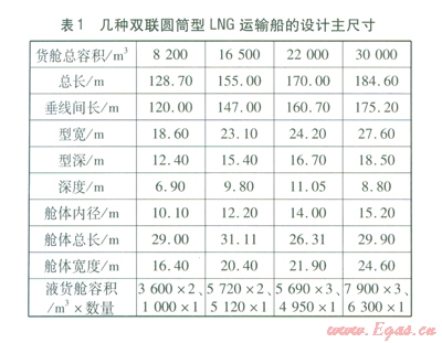 國(guó)內(nèi)外雙聯(lián)圓筒型LNG運(yùn)輸船的設(shè)計(jì)主尺寸[15-16]見表l,支線LNG船的液貨艙尺寸即為表l中容積22