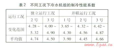 冷水系統(tǒng)基本處于定流量運(yùn)行。冷水機(jī)組并聯(lián)運(yùn)行工況為1號(hào)機(jī)組與2、3號(hào)任意一臺(tái)機(jī)組并聯(lián)運(yùn)行,當(dāng)2號(hào)或3號(hào)冷水機(jī)組負(fù)荷率達(dá)到95%及以上時(shí)開(kāi)啟1號(hào)冷水機(jī)組并聯(lián)運(yùn)行。對(duì)測(cè)試數(shù)據(jù)進(jìn)行整理,得到不同工況下冷水機(jī)組的制冷性能系數(shù)(見(jiàn)表2)。冷水循環(huán)泵效率的變化范圍為73.16%~75.83%,平均值為73.78%。冷水系統(tǒng)輸送能效比變化范圍為0.021 5~0.029 9,平均值為0.026 3。