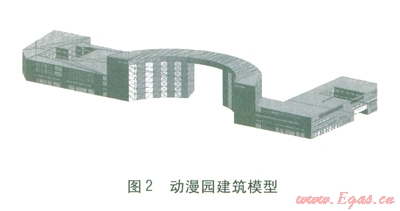 能耗模擬軟件Energyplus在基本使用特性、計(jì)算能力和設(shè)備兼容性等方面較為突出[13-16],但需要友好的用戶圖形界面與之配合[17],Designbuilder是專門針對(duì)Energyplus開(kāi)發(fā)的用戶圖形界面軟件。利用Designbuilder軟件建立動(dòng)漫園建筑模型,見(jiàn)圖2。相關(guān)能耗模擬參數(shù)為:①圍護(hù)結(jié)構(gòu)。外墻傳熱系數(shù)為0.52 W/(m2·K);屋面、樓板傳熱系數(shù)為0.44W/(m2·K);外窗傳熱系數(shù)為2.70 W/(m2·K),自身遮陽(yáng)系數(shù)為0.70,可見(jiàn)光透射比(4個(gè)朝向相同)為0.40,建筑各朝向(含透明幕墻)窗墻比均小于0.70。②散熱量及人員密度。大廳:照明散熱量為13 W/m2,設(shè)備散熱量為13 W/m2,人員密度為0.3人/m2。走廊:照明散熱量為5 W/m2,人員密度為0.025人/m2。餐廳:照明散熱量為9 W/m2,設(shè)備散熱量為5 W/m2,人員密度為0.4人/m2。辦公室:照明散熱量為9 W/m2,設(shè)備散熱量為30 W/m2,人員密度為0.25人/m2。競(jìng)技廳:照明散熱量為18 W/m2,設(shè)備散熱量為30 W/m2,人員密度為0.6人/m2。③新風(fēng)量:大廳、餐廳、競(jìng)技廳大于等于