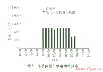 在考慮實(shí)行峰谷電價(jià)的基礎(chǔ)上,冬季典型日聯(lián)供系統(tǒng)的供電功率、供熱量、供冷量分布分別見(jiàn)圖5~7。