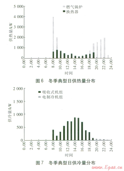 由圖5可知,燃?xì)鈨?nèi)燃機(jī)發(fā)電機(jī)組基本不承擔(dān)谷段電負(fù)荷。由圖6、7可知,考慮到吸收式機(jī)組不能在制冷、制熱兩種工況之間頻繁切換,而且吸收式機(jī)組的制冷性能系數(shù)較高,因此吸收式機(jī)組優(yōu)先用于供冷,采用換熱器、燃?xì)忮仩t用于供熱。