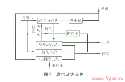 由于該辦公樓規(guī)模較小,岡此聯(lián)供系統(tǒng)采用燃?xì)鈨?nèi)燃機(jī)發(fā)電機(jī)組(包括燃?xì)鈨?nèi)燃機(jī)、發(fā)電機(jī))+余熱型吸收式冷熱水機(jī)組(以下簡(jiǎn)稱(chēng)吸收式機(jī)組),聯(lián)供系統(tǒng)流程見(jiàn)圖4。燃?xì)鈨?nèi)燃機(jī)燃燒天然氣發(fā)電,吸收式機(jī)組利用燃?xì)鈨?nèi)燃機(jī)排放煙氣、缸套冷卻水制冷、制熱,缸套冷卻水也可以通過(guò)換熱器直接供熱,不足冷、熱量由電制冷機(jī)組、燃?xì)忮仩t補(bǔ)充。電制冷機(jī)組優(yōu)先使用聯(lián)供系統(tǒng)所發(fā)電力,不足電量由市電網(wǎng)補(bǔ)充。