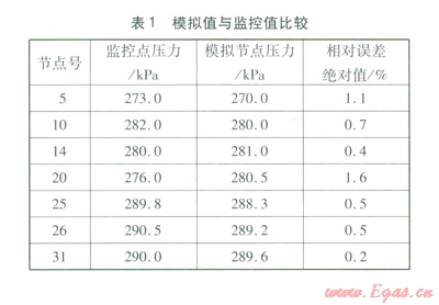 通過實際的數(shù)據收集,對某城市燃氣管網系統(tǒng)進行模擬,將得到的壓力與管網信息管理系統(tǒng)進行對比,見表1。