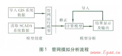 簡單地說,管網模擬就是依據管網信息管理系統(tǒng)的GIS中管網實際情況,在新的界面中構造出模型,通過對模型的統(tǒng)計處理形成所需要的計算模型,然后進行分析模擬。因此,管網的模擬分析可以分為兩大模塊:模型創(chuàng)建與模型分析。管網模擬分析流程見圖l。