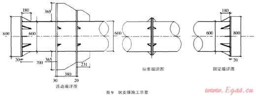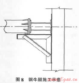 鋼牛腿作為鋼圍檁及支撐桿件重要的豎向力承受構件,應在支撐及鋼圍檁安裝前完成施工及安裝工作,鋼牛腿用3道角鋼焊接而成,為便于鋼圍檁、支撐安裝及支撐活動端預應力施加,在3道角鋼頂焊接了一塊800mm×900mm的鋼板作為施工平臺,鋼牛腿及圍檁施工前應將相應位置的鋼樁保護層鑿除,露出鋼管壁,用焊接方式進行鋼牛腿與鋼樁的連接,有關焊接方法及工藝由施工單位通過現場試驗后提出具體的焊接施工圖,并由設計單位認可后實施。鋼牛腿施工見圖8。
