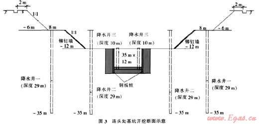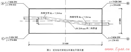 長輸管道定向鉆穿越大型河流時,由于定向鉆穿越長度有限,定向鉆施工采用連續(xù)兩次對穿或多次對穿的方法,為保證管道安全運行,連頭點管道埋深在河道沖刷線以下,但這樣會造成連頭作業(yè)坑開挖困難。根據現場實際勘察,結合我們以往的施工經驗,經過反復研究論證,制訂了連頭作業(yè)坑開挖基坑支護施工方案,采用降坡明溝開挖、降水井、土釘墻、鋼板樁、管道出入口旋噴樁加固和封底等措施,解決了大口徑長輸管道連續(xù)兩次或多次定向鉆穿越大型河流中間連頭基坑開挖的施工難題,為以后類似條件的施工積累了經驗。