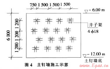 (2)土釘成孔直徑120mm,土釘主筋選用4準18mm,鋼筋間距為0.4m,釘孔內灌注M15水泥砂漿或水泥漿。