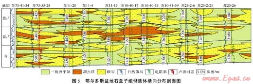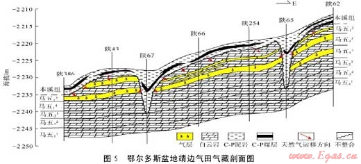 生儲(chǔ)蓋組合大型化發(fā)育是指烴源巖、儲(chǔ)集層與蓋層在三維空間通過(guò)緊密的面狀接觸,或通過(guò)各種通道的連接而形成的生、儲(chǔ)、蓋組合體大規(guī)模分布。由于烴源巖與儲(chǔ)集體群的大型化發(fā)育,因而組合的規(guī)模也呈大型化分布。中國(guó)陸上大型含油氣盆地與中低豐度油氣資源大型化成藏有關(guān)的生儲(chǔ)蓋組合類型主要有4種(見圖4):①?gòu)V覆式組合,即烴源巖在下,儲(chǔ)集體在上,二者以席狀方式大面積緊密接觸,規(guī)模相當(dāng)大。這類組合以鄂爾多斯盆地石炭-二疊系海陸過(guò)渡相煤系碎屑巖組合最為典型,儲(chǔ)集體群整體覆蓋于烴源灶之上,這為天然氣從烴源巖排出以后,整體規(guī)模進(jìn)入儲(chǔ)集體群并大型化成藏創(chuàng)造了極為有利的條件。②三明治式組合,即烴源巖與儲(chǔ)集體以間互方式緊密接觸,大規(guī)模分布。這類組合以四川盆地上三疊統(tǒng)須家河組最典型,須一、三、五段為主要?dú)庠磶r,而須二、四、六段是主要儲(chǔ)集層,二者間互發(fā)育,分布面積達(dá)11.3×104km2。氣源巖排出的烴類可規(guī)模進(jìn)入鄰近儲(chǔ)集體并大范圍成藏。③轉(zhuǎn)接式組合,是指烴源灶與儲(chǔ)集體并不直接接觸,而是通過(guò)呈網(wǎng)狀分布的斷層和面狀分布的不整合與儲(chǔ)集體群相聯(lián)系以保證油氣發(fā)生規(guī)模運(yùn)聚的一類生儲(chǔ)蓋組合。這類組合以塔里木盆地塔中和塔北隆起斜坡區(qū)的奧陶系一間房組、良里塔格組和鷹山組為代表。④倒灌式組合,是指烴源巖以“鍋蓋”方式,覆蓋于儲(chǔ)集體之上,上覆烴源巖形成的油氣以倒灌方式進(jìn)入下伏儲(chǔ)集體并大型化成藏。這也是一類規(guī)模相當(dāng)大的儲(chǔ)蓋組合,以鄂爾多斯盆地中部奧陶系馬家溝組為代表(見圖5),石炭-二疊系煤系烴源灶直接覆蓋于馬家溝組風(fēng)化殼儲(chǔ)集層之上,天然氣呈倒灌方式進(jìn)入下伏儲(chǔ)集體成藏。目前僅靖邊氣田就已發(fā)現(xiàn)氣藏近160個(gè),控制含氣面積約1.0×104km2,探明天然氣地質(zhì)儲(chǔ)量4337×108m3、基本探明地質(zhì)儲(chǔ)量330×108m3,控制天然氣儲(chǔ)量2087×108m3,三級(jí)地質(zhì)儲(chǔ)量達(dá)6754×108m3。