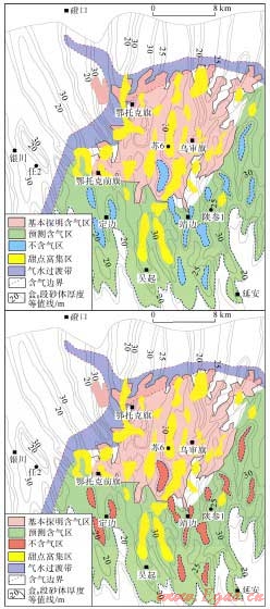 大面積成藏組合是指受連續(xù)性較好、油氣源供給充足的烴源灶控制的一類成藏組合,這類組合主要分布于鄂爾多斯盆地石炭-二疊系的海陸過(guò)渡相砂巖層系中。此外,一些鄰近主力氣源灶的碎屑巖層系,也有發(fā)育這類組合的可能性,如準(zhǔn)噶爾盆地環(huán)瑪納斯湖生烴中心的二疊系佳木河組、夏子街組和烏爾禾組,鄂爾多斯盆地靠近烴源灶的太原組,四川盆地鄰近川西主力氣源灶的上三疊統(tǒng)須家河組,以及須一、三、五段主力氣源巖層系內(nèi)部的砂巖體等。