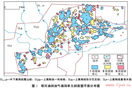 大型化成藏包含兩方面含義:①成藏要素的大型化發(fā)育與平面上的規(guī)模變化。從成藏要素看,烴源灶、儲(chǔ)集體以及生儲(chǔ)蓋組合的分布面積至少在數(shù)千甚至上萬(wàn)平方千米以上,如鄂爾多斯盆地上古生界石炭系煤系烴源巖與二疊系碎屑巖儲(chǔ)集層,分布面積都超過(guò)20×104km2。從成藏要素的規(guī)模變化看,烴源灶、儲(chǔ)集體的平面分布存在強(qiáng)烈的非均勻性,致使形成的地層和巖性圈閉在橫向上具有多變性,呈集群式分布。如塔里木盆地輪南—塔河奧陶系碳酸鹽巖縫洞型大油氣田,可以劃分出數(shù)百個(gè)縫洞單元,每個(gè)縫洞單元都是一個(gè)相對(duì)獨(dú)立的油氣聚集單元,形成的油氣藏呈集群式分布(見圖2)。②成藏分布樣式上表現(xiàn)為薄餅式或集群式成藏,這是中低豐度油氣藏群區(qū)別于常規(guī)高豐度油氣藏(田)和非常規(guī)連續(xù)型油氣聚集最典型的特征。