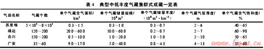 集群式成藏是指油氣在一系列呈集群式發(fā)育的地層、巖性圈閉中聚集而形成的一類成藏現(xiàn)象。這是由于在克拉通盆地平緩臺(tái)地區(qū)的碳酸鹽巖層系、陸內(nèi)坳陷海陸過(guò)渡相與陸相層系以及前陸盆地緩翼廣大斜坡區(qū)的陸相沉積層系中,因建設(shè)性成巖和后生成巖改造作用,或由于原始沉積物源區(qū)巖性多變、水動(dòng)力能量多變等,導(dǎo)致儲(chǔ)集層非均質(zhì)性強(qiáng),形成眾多呈獨(dú)立或半獨(dú)立狀分布的聚集體,就像玻璃板中眾多大小不一的氣泡,單體規(guī)模不大,但儲(chǔ)集體眾多則形成了規(guī)模巨大的集合體(見表4)。當(dāng)油氣充注后,不僅形成的油氣藏群規(guī)模很大,而且這些規(guī)模巨大的油氣藏群對(duì)封蓋條件的要求也不高,只要有遮擋條件(多數(shù)小于幾個(gè)兆帕)就可規(guī)模成藏,其中豐度較高的油氣藏(俗稱“甜點(diǎn)”)是油氣勘探的重點(diǎn)。如鄂爾多斯盆地蘇里格氣田盒8段心灘砂體,由于巖性、物性橫向變化劇烈,致使大氣田由成千上萬(wàn)個(gè)單體規(guī)模較小的氣藏群構(gòu)成,常規(guī)小型巖性氣藏之間連續(xù)或不連續(xù)分布著含氣飽和度較低的致密氣層、干層或水層(蘇里格西區(qū)低部位),總體表現(xiàn)為非常規(guī)氣與常規(guī)氣的混合共生。根據(jù)對(duì)蘇里格氣田的解剖,氣田的含氣面積接近3.3×104km2,依據(jù)砂體形態(tài)可以確定的氣藏?cái)?shù)量約5×104~8×104個(gè),單個(gè)氣藏氣柱高度2~6m、儲(chǔ)量規(guī)模一般在3000×104~10000×104m3,整個(gè)氣田的平均儲(chǔ)量豐度約0.7×108m3/km2。致密砂巖普遍含氣,含氣飽和度不高但連續(xù)分布。