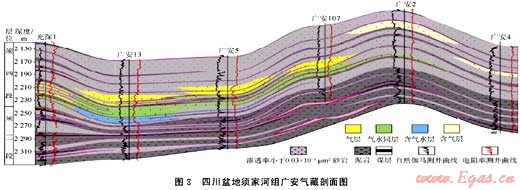 大范圍成藏組合是指“甜點(diǎn)”富集油氣,而成藏范圍很廣的一類成藏組合。這類組合主要形成于三明治式組合和倒灌式組合之中,以四川盆地川中地區(qū)須家河組和鄂爾多斯盆地中部奧陶系馬家溝組巖溶風(fēng)化殼代表。勘探揭示,單一有經(jīng)濟(jì)性的油氣聚集范圍有限,但平面上由數(shù)十乃至上百個(gè)油氣藏散布于廣闊的區(qū)域內(nèi),油氣藏之間多被水區(qū)、致密區(qū)構(gòu)成的“天窗”阻隔,具有斑塊狀成藏特征。研究表明,導(dǎo)致成藏分布不連續(xù)的原因有二:①烴源灶分布不均勻、供烴總量不充分,近源儲(chǔ)集體優(yōu)先成藏;②儲(chǔ)集體的連續(xù)性較差,導(dǎo)致形成的油氣藏在很大的范圍內(nèi)呈星羅棋布式分布。如四川盆地須家河組氣藏(見圖8),由于須一、三、五段煤系源巖的連續(xù)性平面變化較大,一些區(qū)域煤系烴源巖明顯減薄甚至缺失,致使與之接觸的須二、四、六段儲(chǔ)集層中含氣飽和度與資源豐度平面上有明顯變化,煤系烴源巖減薄區(qū)(俗稱“天窗區(qū)”)成藏機(jī)率低,而優(yōu)質(zhì)烴源巖和有效儲(chǔ)集層疊置區(qū)是天然氣的主要富集區(qū),形成的氣藏儲(chǔ)量豐度與含氣飽和度相對(duì)較高。