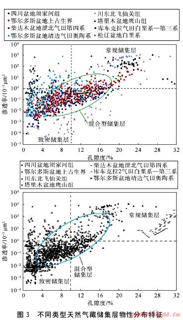 根據(jù)對(duì)已發(fā)現(xiàn)油氣藏地質(zhì)特征的分析,中國(guó)油氣資源目前可以劃分為3大類:①常規(guī)油氣資源,以已發(fā)現(xiàn)的高豐度油氣田(藏)為代表;②非常規(guī)油氣資源,包括部分致密砂巖氣、致密油、煤層氣和頁(yè)巖氣等,也可稱之為連續(xù)型油氣聚集;③混合型油氣資源,由常規(guī)和非常規(guī)油氣資源混合而成,在地質(zhì)含義上等同于中低豐度油氣藏群?;旌闲陀蜌赓Y源有3方面特點(diǎn):①儲(chǔ)集體物性和儲(chǔ)集層結(jié)構(gòu)特征處于常規(guī)儲(chǔ)集層和非常規(guī)儲(chǔ)集層的過(guò)渡區(qū),具明顯的混合性(見圖3)。②油氣成藏存在兩種機(jī)制,既有常規(guī)油氣藏主要通過(guò)達(dá)西流動(dòng),以體積流方式成藏;也有非常規(guī)油氣(主要是致密砂巖油氣),主要通過(guò)非達(dá)西流動(dòng),以擴(kuò)散流方式成藏,成藏機(jī)制具有雙重性。③資源構(gòu)成具有二元性。若以儲(chǔ)集層地下滲透率小于0.1×103μm2、地面滲透率小于1×103μm2為標(biāo)準(zhǔn),統(tǒng)計(jì)中國(guó)陸上已發(fā)現(xiàn)的中低豐度(亦稱低滲透)天然氣儲(chǔ)量,常規(guī)氣約占35%,非常規(guī)氣約占65%。