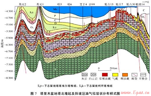 似層狀成藏是碳酸鹽巖巖溶縫洞型儲(chǔ)集層的主要成藏樣式??死ㄅ璧乩^承性古隆起圍斜部位受風(fēng)化巖溶以及順層、層間巖溶作用的綜合影響,廣泛發(fā)育似層狀分布的巖溶縫洞型儲(chǔ)集層,當(dāng)充注油氣后,就形成了似層狀油氣分布格局。以塔里木盆地塔北隆起斜坡區(qū)奧陶系一間房組、鷹山組和良里塔格組成藏為例,多種巖溶作用形成的縫洞體數(shù)量多達(dá)數(shù)百甚至上千個(gè),每個(gè)縫洞單元都是一個(gè)相對(duì)獨(dú)立的油氣聚集單元(見圖7)。多套似層狀分布的油氣藏群可以形成大油氣田,如塔河油田、哈拉哈塘油田等,地質(zhì)儲(chǔ)量規(guī)模在數(shù)億噸甚至數(shù)十億噸。