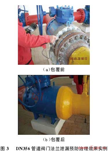 泄漏,然后按照上述施工流程對法蘭進行碳纖維復合材料堵漏加固處理,待復合材料養(yǎng)護固化后,進行耐壓密封試驗。結(jié)果表明:采用碳纖維復合材料進行管道法蘭滲漏治理,管道系統(tǒng)連接法蘭在 10 MPa 介質(zhì)壓力下,露天環(huán)境下穩(wěn)壓 14 d,堵漏區(qū)域無任何泄漏??梢姡撎准夹g(shù)方案對存在泄漏隱患的管道法蘭泄漏治理非常有效。由于該套技術(shù)方案具有作業(yè)不動火、操作安全、成本費用低等特點,2008-2011年,采用復合材料修復技術(shù)對西氣東輸全線 220 多個線路閥室旁通管道 DN356 閥門連接法蘭及各站場與干線連接的DN50 和 DN80 管道法蘭泄漏隱患進行治理(圖 3),在確保管道安全平穩(wěn)運行的同時,節(jié)約了大量維修費用。復合材料修復對法蘭結(jié)構(gòu)具有一定的加固作用,可提高法蘭的抗軸向拉伸、彎曲能力,防止密封面泄漏情況進一步惡化。但是,對于已經(jīng)出現(xiàn)明顯泄漏的高壓(7 MPa 以上)法蘭,治理效果不佳。