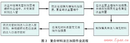 基本原理:對連接法蘭面間隙填充高強度堵漏密封材料,再用由高強度纖維與環(huán)氧粘結(jié)劑組成的復合材料對法蘭連接部位進行整體外包覆,待復合材料結(jié)構(gòu)固化后,形成一個高強度殼體結(jié)構(gòu),實現(xiàn)整體加固,達到預防法蘭泄漏的目的(圖 2)。