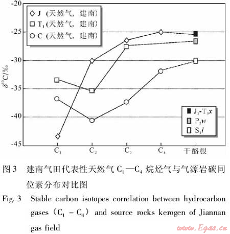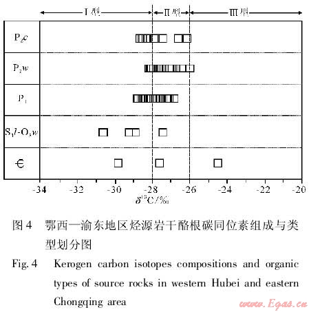 (3)本區(qū)長興組和飛仙關(guān)組天然氣的氣源巖主要為二疊系吳家坪組(P2w)烴源巖,且以Ⅱ型有機質(zhì)為主,能夠生成大量的原油,具備原油裂解作用發(fā)生的物質(zhì)基礎(chǔ)。對于本區(qū)高成熟度的天然氣而言,利用同位素資料進(jìn)行氣—巖對比是比較可靠的方法。本區(qū)侏羅系和石炭系天然氣的丁烷碳同位素分別為-25.0‰和-31.9‰,而三疊系天然氣丁烷的含量低,只測得丙烷碳同位素為-27.6‰,下志留統(tǒng)龍馬溪組(S1l)、吳家坪組(P2w)和侏羅系源巖干酪根的碳同位素均值分別為-30.0‰、-27.0‰和-25.5‰(圖3)。有研究表明,具有氣源關(guān)系的烴源巖的干酪根碳同位素比天然氣丁烷的碳同位素要重1.0‰左右[15]。根據(jù)這種對應(yīng)關(guān)系,侏羅系、三疊系飛仙關(guān)組和石炭系的天然氣應(yīng)該分別來源于侏羅系、二疊系吳家坪組和志留系龍馬溪組烴源巖(圖3)。從生儲配置關(guān)系來看,飛三段與上覆侏羅系之間有較厚的隔層,其氣源也不可能來自于侏羅系烴源巖;并且飛三段天然氣的碳同位素組成明顯重于石炭系天然氣(圖3),其不可能與石炭系天然氣具有相同的氣源巖。對于本區(qū)高過成熟的二疊系烴源巖(Ro均值為2.2%)而言,其有機質(zhì)類型用常規(guī)熱解和元素組成數(shù)據(jù)很難判斷[16],比較可靠的方法是利用源巖干酪根碳同位素數(shù)據(jù)進(jìn)行分析。本區(qū)二疊系吳家坪組烴源巖的干酪根碳同位素值為-26.0‰~-28.2‰,與Ⅱ型有機質(zhì)具有較好的對應(yīng)關(guān)系;志留系烴源巖的干酪根碳同位素在-27.0‰~-31.0‰,主要為Ⅰ型有機質(zhì);寒武系烴源巖的干酪根碳同位素比較分散,類型可能比較復(fù)雜(圖4)。根據(jù)上述分析,本區(qū)吳家坪組烴源巖有機質(zhì)類型主要為Ⅱ型,以生油為主。