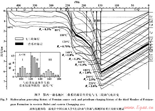 飛三段油氣充注史主要根據(jù)飛三段儲層與烴類包裹體伴生的鹽水包裹體的均一溫度與儲層埋藏?zé)崾反_定。通過鏡下觀察,發(fā)現(xiàn)本區(qū)飛三段儲層膠結(jié)物中可見較多瀝青包裹體和天然氣包裹體,以及少量油包裹體。據(jù)前人研究,瀝青包裹體為油包裹體經(jīng)歷高溫之后的殘留產(chǎn)物[19],因此,可測定與瀝青包裹體伴生的鹽水包裹體的均一溫度代表古原油充注時的溫度。均一溫度的測定與統(tǒng)計結(jié)果(圖5):與瀝青包裹體伴生的鹽水包裹體的均一溫度在90~120℃;與天然氣和少量瀝青包裹體伴生的鹽水包裹體的均一溫度在120~140℃;與天然氣包裹體伴生的鹽水包裹體的均一溫度在140~180℃。把這3期均一溫度投影到地層埋藏史圖上(圖5),可知第Ⅰ期和第Ⅱ期大致與二疊系烴源巖的生油期相對應(yīng),而第Ⅲ期與烴源巖的生氣階段對應(yīng)。因此,認(rèn)為飛三段在侏羅紀(jì)主要發(fā)生了3期油氣充注:第Ⅰ期主要為原油充注;第Ⅱ期為原油充注,伴有天然氣充注;第Ⅲ期主要為天然氣充注。第Ⅲ期的天然氣充注,可能主要與儲層古原油裂解產(chǎn)生的天然氣有關(guān)。根據(jù)前人研究成果,認(rèn)為150℃是原油穩(wěn)定存在的上限溫度[20],而飛三段儲層在晚侏羅世的最高溫度接近180℃,表明具備原油裂解作用發(fā)生的溫度條件,飛三段古油藏在晚侏羅世基本全部裂解成氣藏。原油裂解作用發(fā)生的時間與第Ⅲ期天然氣充注的時間吻合,進(jìn)一步證明儲層中發(fā)生了原油裂解作用。