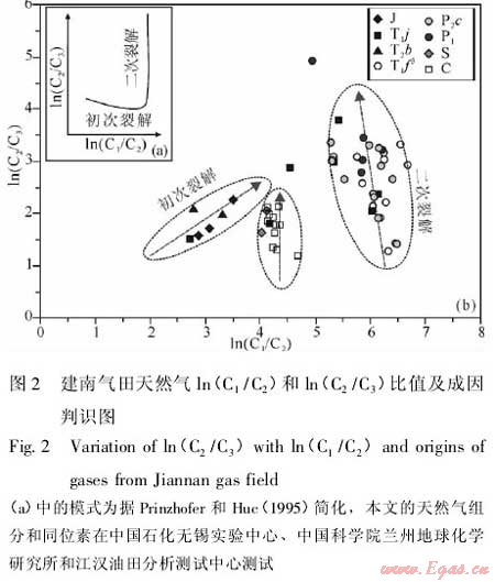 (1)天然氣的成分組成具有原油二次裂解氣的特征。飛三段(T1f3)和長興組(P2c)天然氣的烷烴氣中以甲烷為主(相對含量在99%以上),為成熟度很高的干氣。有機成因的烷烴氣大致包括生物氣、干酪根熱解氣和原油裂解氣。本區(qū)天然氣甲烷的碳同位素在-30.0‰~-33.0‰,可排除生物成因氣。因此,對本區(qū)天然氣的成因判識的關(guān)鍵是區(qū)分干酪根熱解氣和原油裂解氣。這兩類成因天然氣,目前國內(nèi)外學(xué)者主要用ln(C1/C2)與ln(C2/C3)關(guān)系圖進(jìn)行判識[10-13]。干酪根初次熱解氣以甲烷的迅速增加為特征,ln(C1/C2)值不斷增大而ln(C2/C3)值相對穩(wěn)定;原油二次裂解氣以丙烷的迅速減少為特征,ln(C2/C3)值明顯增大而ln(C1/C2)值變化不大(圖2(a))。如圖2(b),研究區(qū)嘉陵江組(T1j)、飛三段(T1f3)、長興組(P2c)和下二疊統(tǒng)(P1)天然氣的ln(C1/C2)值在5~7,ln(C2/C3)值在1~4,總體符合ln(C2/C3)迅速增大、ln(C1/C2)相對穩(wěn)定的原油二次裂解氣的基本特征,志留系(S)與石炭系(C)的天然氣(ln(C1/C2)值在4~5,ln(C2/C3)值在1~2.5)也具有類似的特征,但分布范圍與前者明顯區(qū)別,表明這兩類天然氣的來源可能不同。三疊系巴東組(T2b)和侏羅系(J)的天然氣的ln(C1/C2)值在2.5~3.5,ln(C2/C3)值在1~2.5,總體表現(xiàn)為ln(C1/C2)值不斷增大而ln(C2/C3)值相對穩(wěn)定的干酪根初次熱解氣的特征。