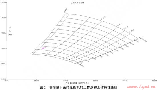目前國(guó)內(nèi)已經(jīng)可以利用水力仿真軟件SPS模擬壓縮機(jī)工作曲線,完成壓縮機(jī)組的適用性分析。從不同輸量條件下某站壓縮機(jī)的工作點(diǎn)和工作特性曲線(圖2、圖3)明顯可見(jiàn)管道的水力工作點(diǎn)、壓縮機(jī)喘振曲線、堵塞曲線,最高轉(zhuǎn)速曲線、最低轉(zhuǎn)速曲線、效率曲線、不同轉(zhuǎn)速的揚(yáng)程曲線。
