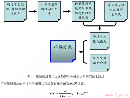 在西氣東輸二線管道工程中,提出了壓縮機(jī)組備用方案經(jīng)濟(jì)性分析的定量研究技術(shù)路線(圖 1)和計(jì)算方法。其中單臺(tái)燃驅(qū)、電驅(qū)機(jī)組的可用率根據(jù)管道運(yùn)行單位的統(tǒng)計(jì)數(shù)據(jù)得出。