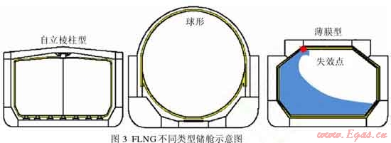 隨著 LNG 貨輪技術(shù)的不斷進(jìn)步,最近幾年提出的 FLNG 概念設(shè)計(jì)均采用鋼質(zhì)船體,配以不同形式的LNG 儲(chǔ)艙(圖2)。如 Shell 公司投資建造了一艘巨型 FLNG,采用雙殼式船身,SPB 型儲(chǔ)艙,長(zhǎng)488m,寬74m;空載質(zhì)量達(dá)26×104t,相當(dāng)于6艘航空母艦,滿載質(zhì)量達(dá)60×104t。該 FLNG 投資估計(jì)超過30×108美元,每年至少生產(chǎn)530×104t 液態(tài)產(chǎn)品,包括360×104t LNG、130×104t 凝析油和40×104t LPG。