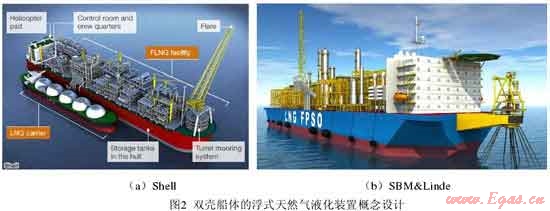 最初,FLNG 概念設(shè)計(jì)采用混凝土制造船體,在其上放置球形、圓柱形或薄膜型 LNG 儲(chǔ)艙?;炷翚んw吃水深,承載能力大,具有低溫性能好、不易老化的優(yōu)點(diǎn),但是這種結(jié)構(gòu)的船身笨重,遷移和錨泊將是巨大的挑戰(zhàn)。代表性的 FLNG 概念設(shè)計(jì)有:Mobil 公司的 Floating LNG 和 Bouygues Offshore 公司的 Azure項(xiàng)目(圖1)。