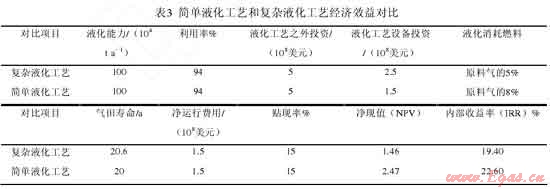 David Franklin等[4]對(duì) FLNG 采用簡(jiǎn)單液化工藝和復(fù)雜液化工藝的經(jīng)濟(jì)效益進(jìn)行比較,發(fā)現(xiàn)采用簡(jiǎn)單液化工藝效益更好(表3),液化能力同為100×104t·a-1的浮式天然氣液化裝置項(xiàng)目,采用簡(jiǎn)單液化工藝的凈現(xiàn)值是采用復(fù)雜液化工藝凈現(xiàn)值的1.69倍,內(nèi)部收益率高出3.2%??梢?,與陸上 LNG工廠不同,FLNG 對(duì)初始投資更敏感。簡(jiǎn)單液化工藝具有占用甲板面積小、設(shè)備少、檢修時(shí)間短、可在有限甲板空間上獲得較高產(chǎn)量等優(yōu)點(diǎn),更適用于 FLNG。