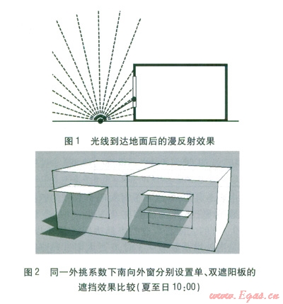 室內(nèi)的采光和視野。同一外挑系數(shù)下南向外窗分別設(shè)置單、雙遮陽板的遮擋效果比較(夏至日10:O0)見圖2。由圖2可知,設(shè)置雙遮陽板也能加強對直射光的遮擋。當(dāng)直射光從非正南入射時,第二遮陽板能夠有效地削弱進入室內(nèi)的太陽直射光,并且能將投射到下遮陽板的直射光以漫反射的形式投射到室內(nèi)深處,加強室內(nèi)深處的采光效果。