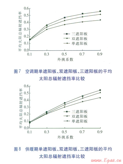 ①單純考慮太陽直射輻射時,單遮陽板的外挑系數(shù)宜控制在0.3左右。