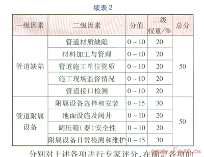 燃氣管道的風險評價方法通常以W.Kent Muhlbaue提出的風險評價模型(評分法)為依據(jù),在W.Kent Muhlbaue所著的《管道風險管理手冊》中確定的4類評分指標分別是第三方指數(shù)、腐蝕指數(shù)、設(shè)計指數(shù)、誤操作指數(shù)[3],對長輸油氣管道有很強的針對性,不一定完全適用于城市埋地燃氣管道。在本文評分指標體系的構(gòu)建中,將把文獻[3]評分法中不相關(guān)、不適應(yīng)的指標予以剔除,根據(jù)城鎮(zhèn)燃氣管道的特點對指標重新分類,并進行適當調(diào)整和補充,確定4大評分指數(shù),分別為腐蝕指數(shù)、外界干擾指數(shù)、管道缺陷指數(shù)、管道附屬設(shè)備失效指數(shù)。城市燃氣管道風險評價評分表見表2。